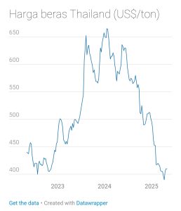 Harga beras sudah mulai naik ke US$ 410 [er ton pada hari ini, Kamis (08/05/25) tetapi masih di level terendah sejak September 2022 atau dua tahun lebih.