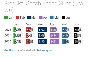 Badan Pusat Statistik (BPS) memperkirakan produksi Gabah Kering Giling (GKG) pada Januari-Juni 2025 mencapai 32,58 juta ton atau naik hampir 12% dibandingkan periode yang sama tahun lalu.