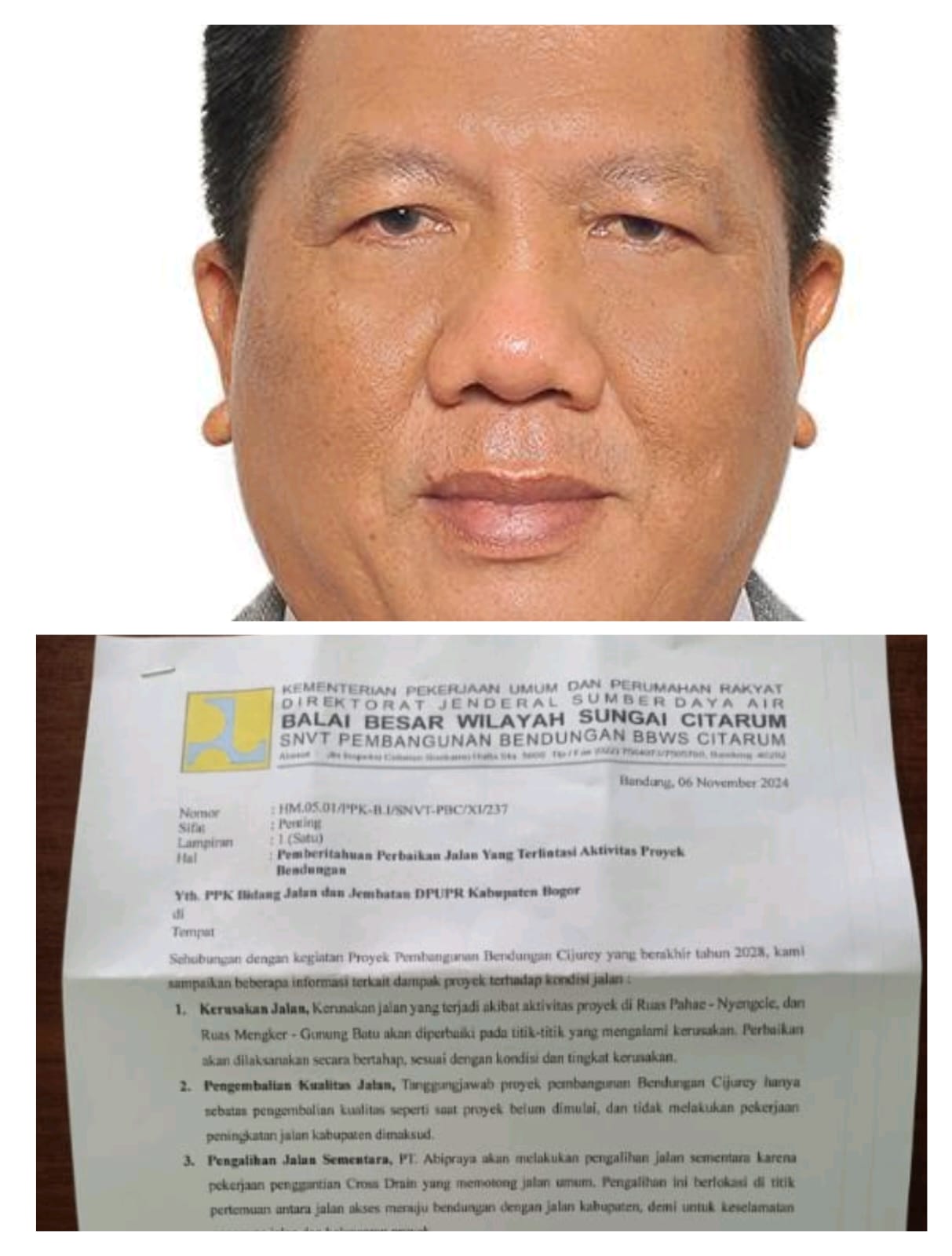“Punten kang, bahwa jalan kabupaten di wilayah Kecamatan Jonggol ada dua ruas jalan yang terdampak proyek PSN Bendungan Cijuray,” ujarnya.