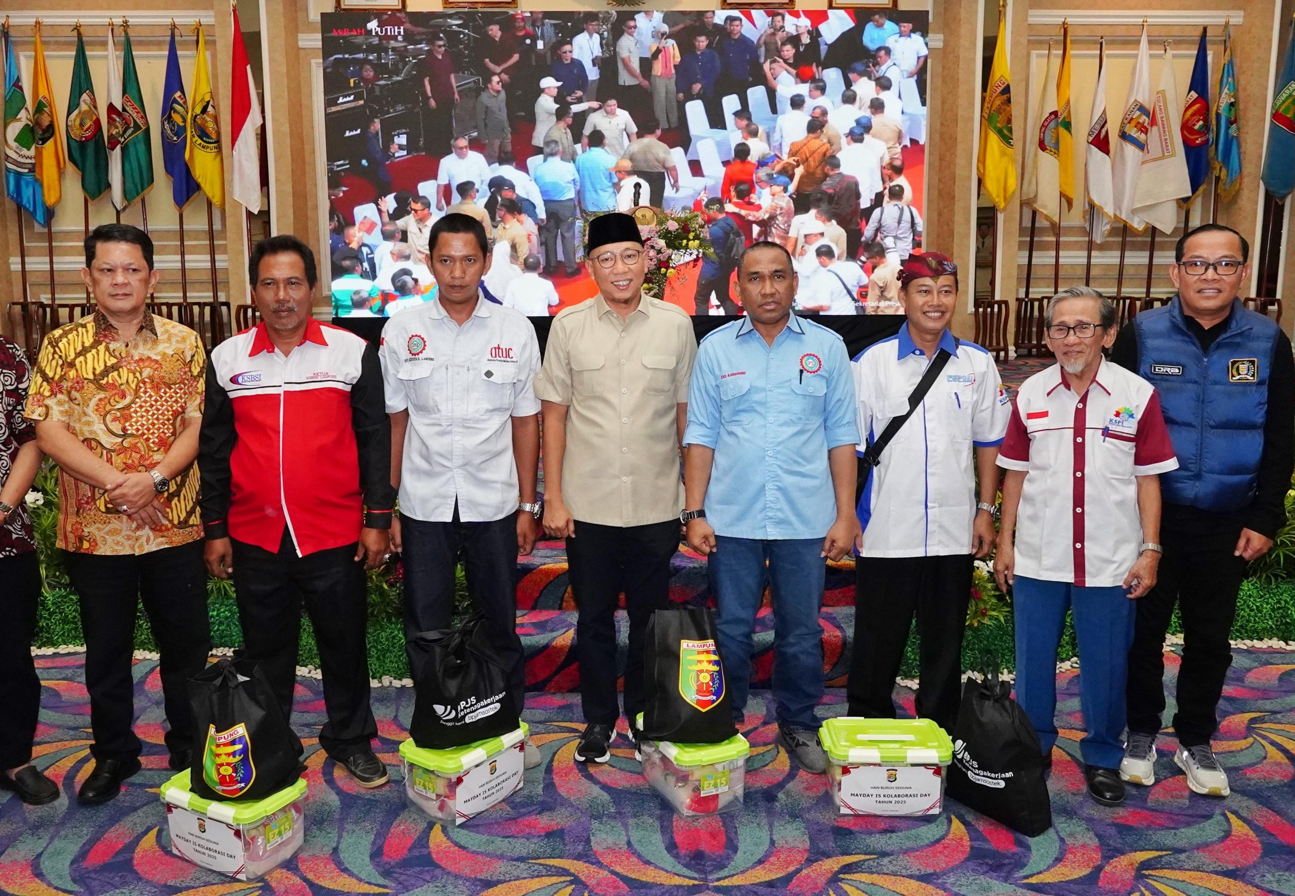Dalam kesempatan tersebut, Gubernur Rahmat Mirzani Djausal secara simbolis menyerahkan bantuan kepada perwakilan buruh sebagai bentuk perhatian dan dukungan Pemerintah Provinsi Lampung.