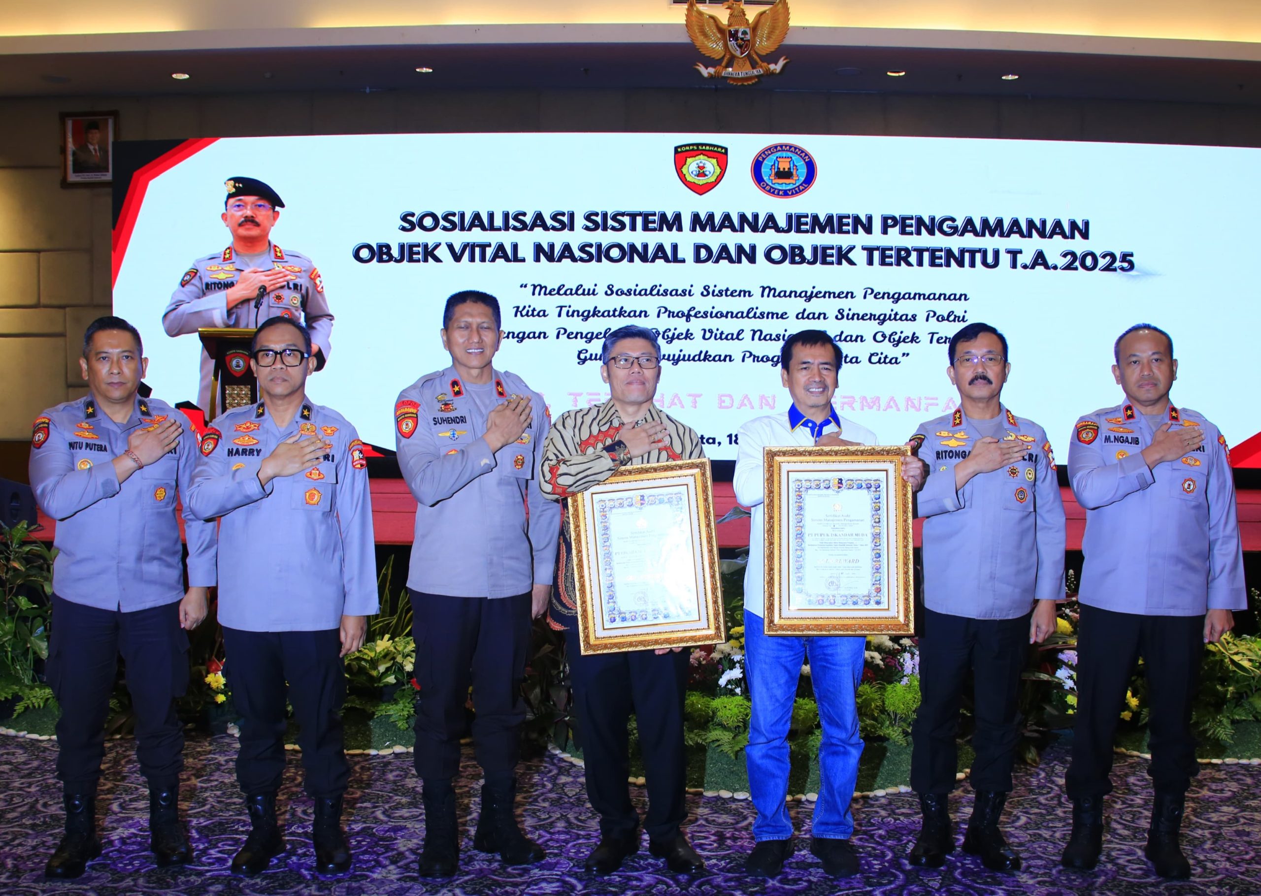 Rambaberita.com, JAKARTA – Sukses Terapkan Sistem Manajemen Pengamanan (SMP) dua pengelola obvitnas PT Cikarang Listrindo Tbk dan PT Pupuk iskandar muda di ganjar sertifikat, sertifikat diserahkan langsung oleh Irjen Pol Drs. M.H. Ritonga sebagai apresiasi dari Kapolri Jenderal Listyo Sigit Prabowo yang di serahkan Melalui Kakorsabhara Baharkam Polri, penyerahan digelar Hotel Royal Palm, Jakarta Barat, Rabu (18/06/25).