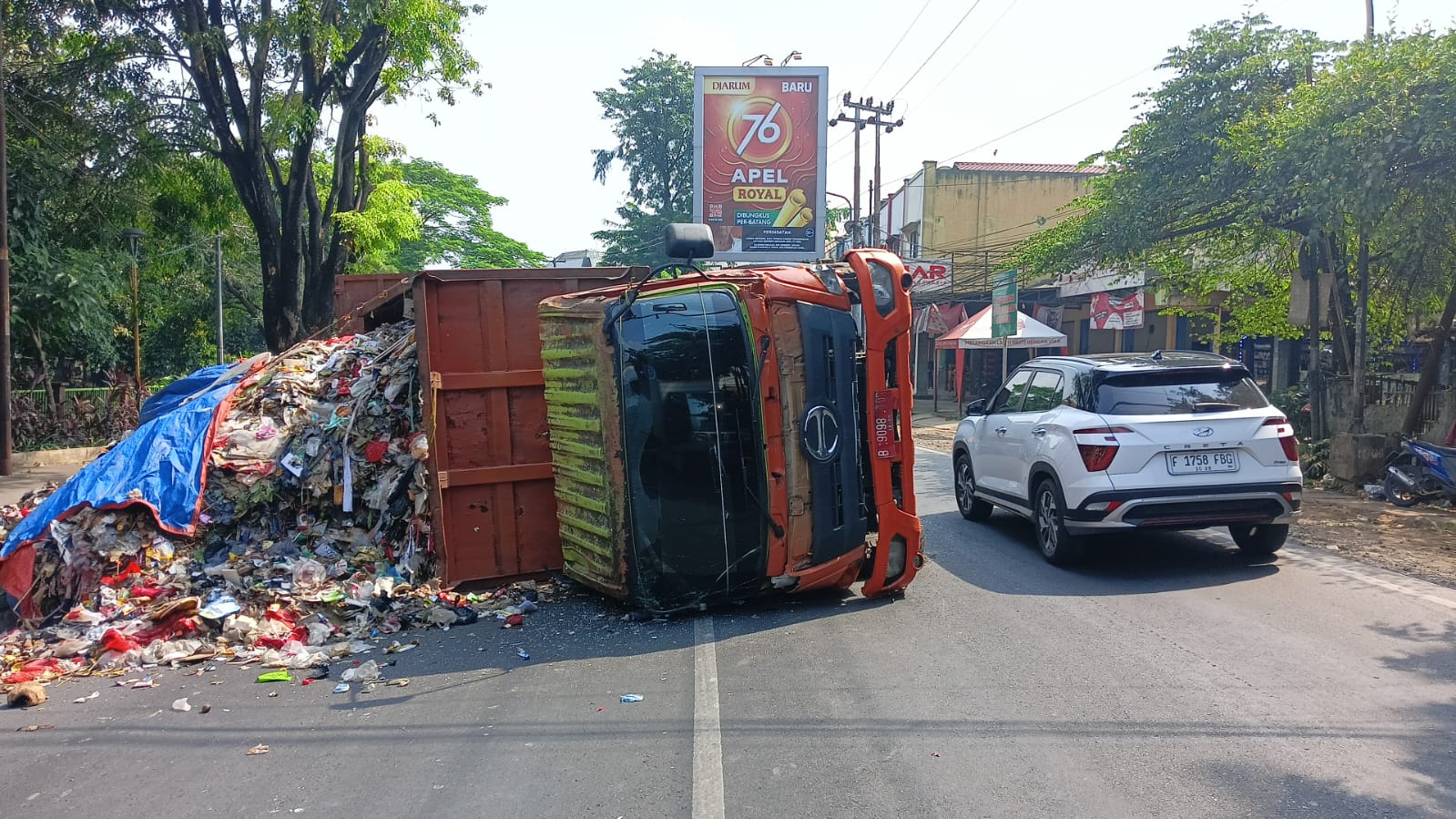 Truk Sampah UPST Bantar Gebang Terbalik di Jalan Raya Narogong, Picu Kemacetan